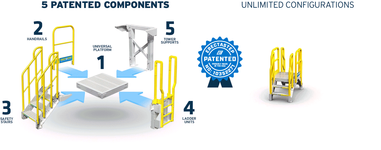 ErectaStep’s 5 components; Metal Steps, Platforms, Handrails, Ladders and Tower Supports, give you unlimited configuration options for tremendous design flexibility. These lightweight aluminum components are as easy to assemble as they are to configure. Installation only takes a few hours and requires little more than a wrench. That means no boom truck or heavy crane as most installations take a simple hand truck and two installers. Additionally, configurations can be modified by adding components or easily re-configured at any time.